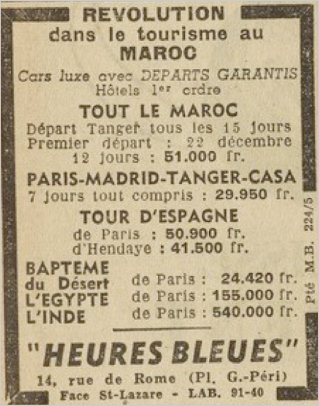 Quoi qu’il en soit, à côté des villes côtières, ce sont les villes impériales – Fès, Meknès, Marrakech, Rabat – et leurs environs qui deviennent des destinations touristiques dans l’entre-deux-guerres. Il faudra attendre l’après-guerre pour voir l’offre touristique se diversifier. Stations balnéaires, excursions en montagne, circuits… Les encarts publicitaires se multiplient dans la presse française du début des années 1950.
